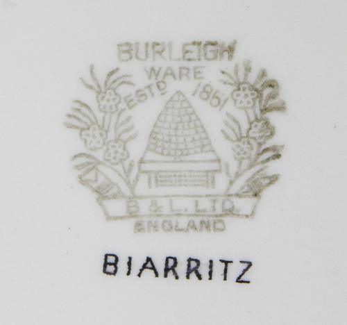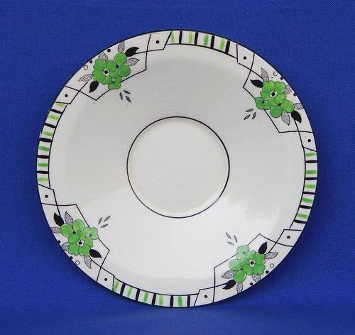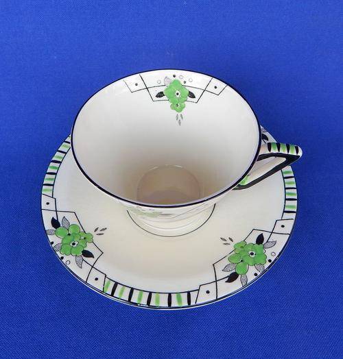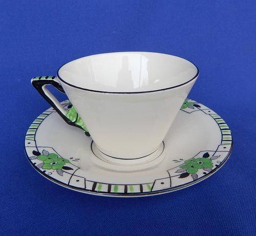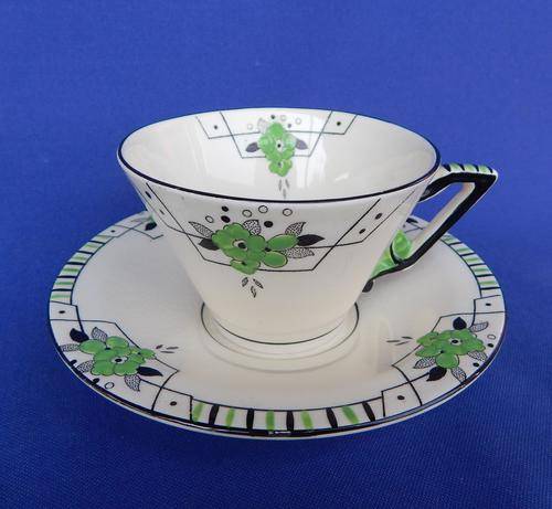 This Burleigh Ware Art Deco "Biarritz" Duo is in Ivory with a Green and Black Geometric Design with a Zenith Shaped Cup. Both pieces have the Burleigh Ware Beehive Backstamp dating it to the 1930's.