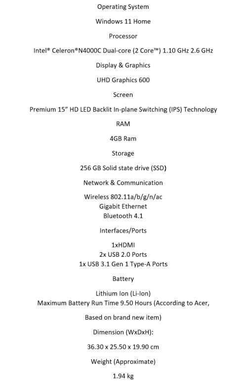 BUSINESS CLASS ACER ASPIRE 9th Gen Intel® Celeron | 4GB RAM | 256 GB SSD
