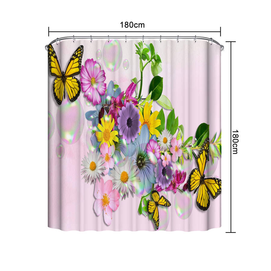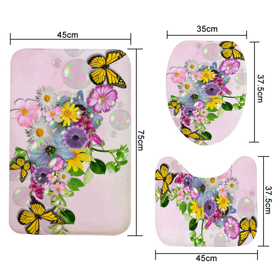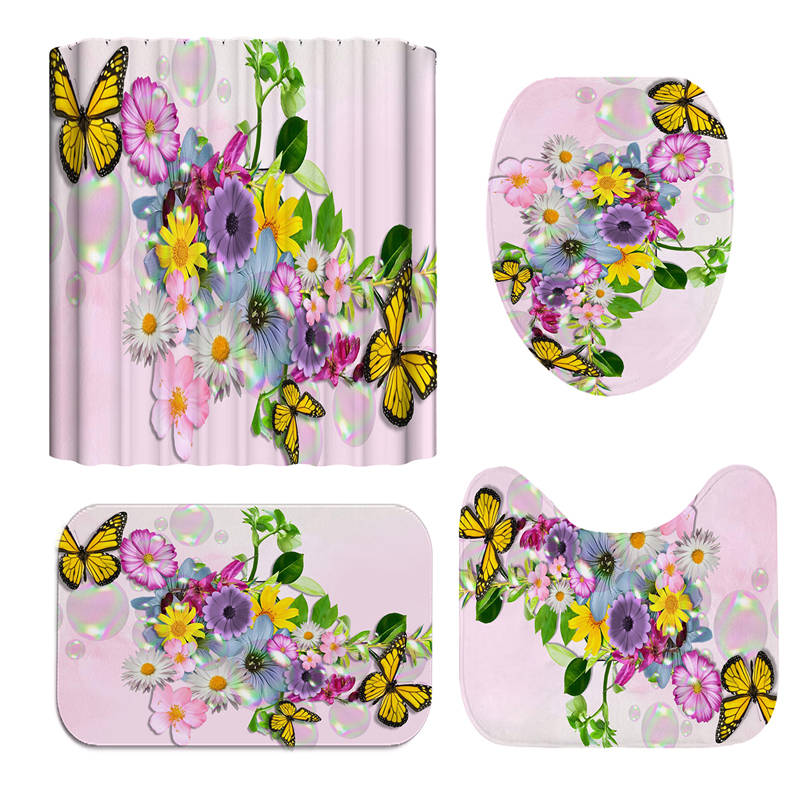 Butterfly Flower Pattern Shower Curtain Toilet Lid Cover Pedestal Rug Non-slipWaterproofBath Mat Bathroom Decoration Set