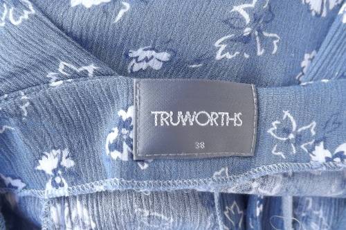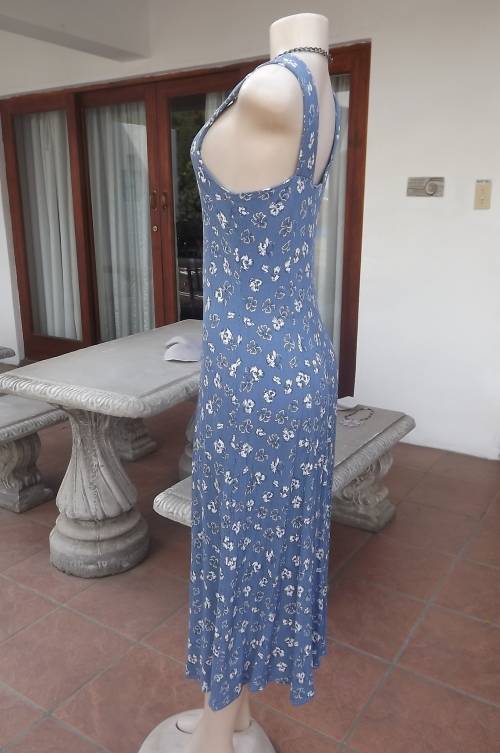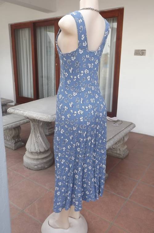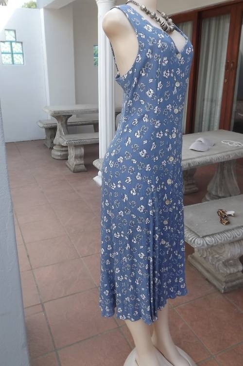 Button down steelblue 100% rayon dress,creased with white floral pattern.Size 38/14 by TRUWORTHS. Open neckline with wide straps.Princess style.Good condition