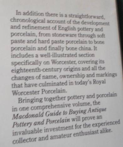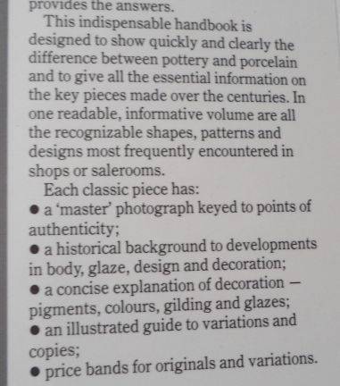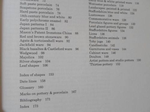 SLIPWARE , DELFWARE , DELF , BLUE AND WHITE , ORIENTAL POLYCHROME , WHITE SALT GLAZED , CREAMWARE , SOAPSTONE , POLYCHROME ENAMEL , JAPAN PATTERNS , MASON'S PATENT IRONSTONE CHINA , RED AND BROWN STONEWARE , JACKFIELD WARE , BLACK BASALTES & CASTLEFORD WARE , WEDGWOOD , MAJOLICA , LEAF SHAPES , MEISSEN , BIRDS , WORCESTER , STAFFORDSHIRE , LEAD GLAZED , LIONS , TOBY JUGS , CANDLESTICK , CABINET WARE , DOULTON ,