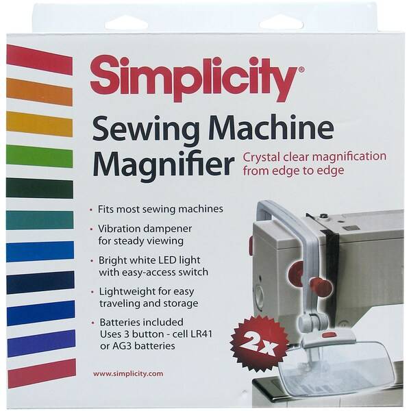 WRIGHTS-C.C. Bigger Sewing Machine Magnifier. This is the next big thing for sewers and quilters; a sewing machine magnifier that expands the area of focus far beyond others and will not interfere with your sewing. A large 2-1/2x5in magnification field for 12-1/2in square inches of vision! Magnifier clamps securely onto any sewing machine with 2x power magnification; it minimizes sewing machine vibrations with a unique dampener and features a bright LED light with easy-to-reach switch and three button batteries (LR41 or AG3) included. Imported.