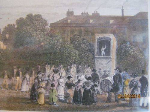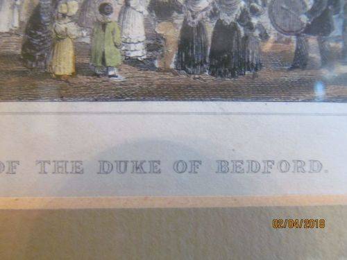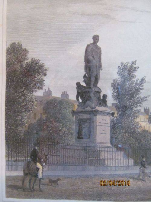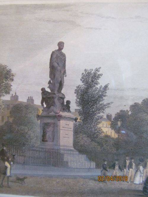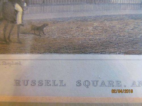 FRAMED ANTIQUE (19th C) HAND COLORED LINE ENGRAVING - RUSSELL SQUARE, AND STATUE OF THE DUKE OF BEDFORD by C. MOTRAM