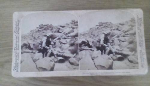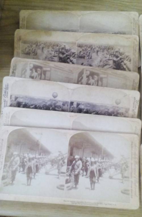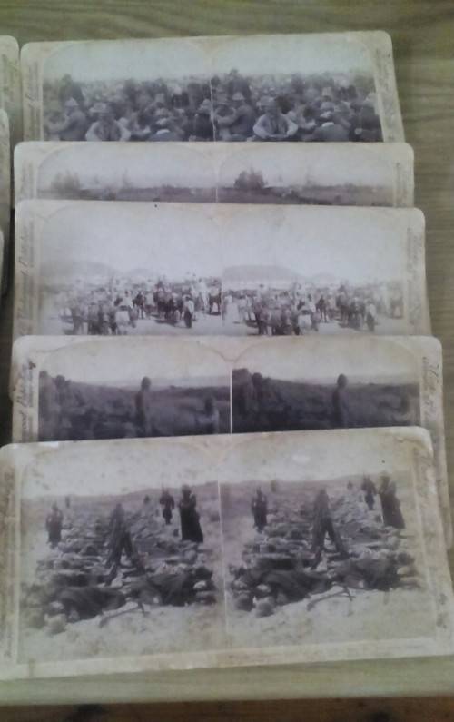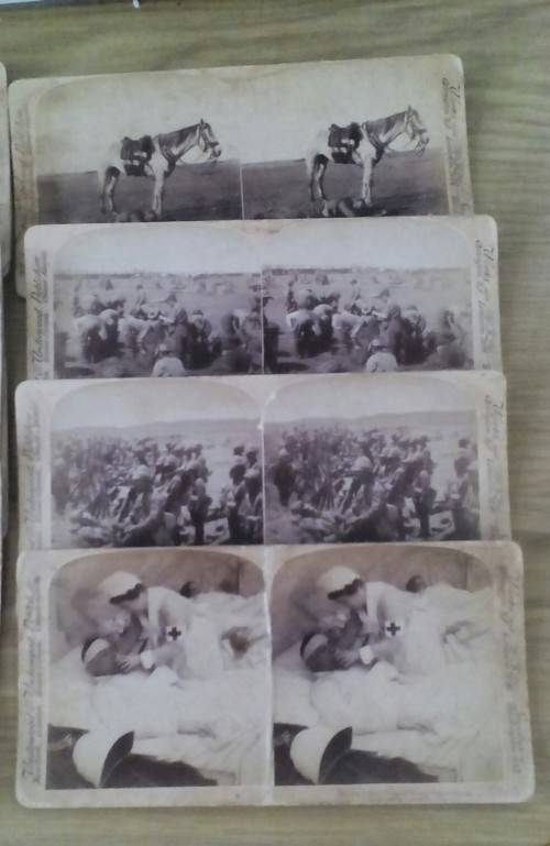 PERFECSCOPE stereoscopic 3D viewer with 37 ANGLO BOER WAR photographs.Featuring photographs of battlescenes,generals,prisoners of war, hospital scenes etc etc by Underwood and Underwood Publishers.Two photographs per slide measuring 8.8 cm x 17 cm.Entitled to front in English and to back in English, French, German, Portuguese,Dutch and Russian.PERFECSCOPE 30 cm long with fold away handle and separate sliding photograph holder.Has requisite patent numbers from 1895 and manufacturers details.Photographs intact but wear and tear commensurate with age and use but overall good condition . PERFECSCOPE in good condition.
