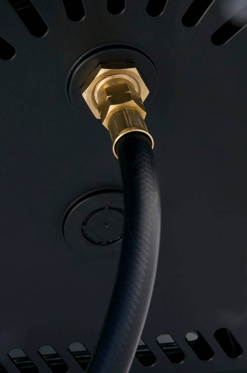 Operates off a refillable LP gas cylinder (not included) that connects to a hose and regulator (included)
