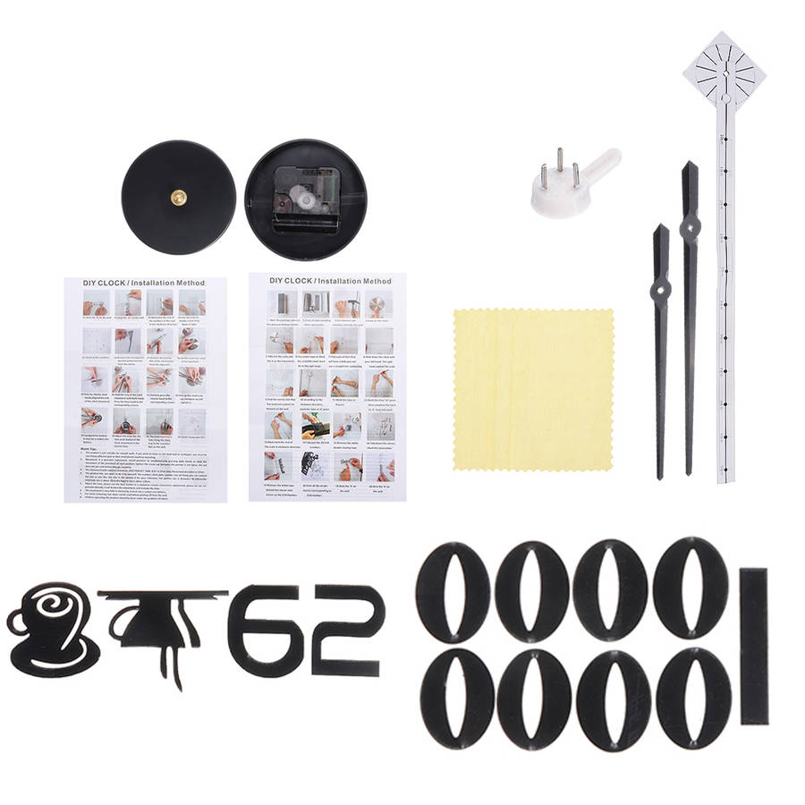 Sticker material: EVA Foam (Ethylene Vinyl Acetate) Clock material: Acrylic with Mirror Effect Hour hand: 31.5 cm / 23.5 cm Minute hand: 39 cm / 31.5 cm Clock machine:12 cm/ 10 cm The clock final decoration size up to you.