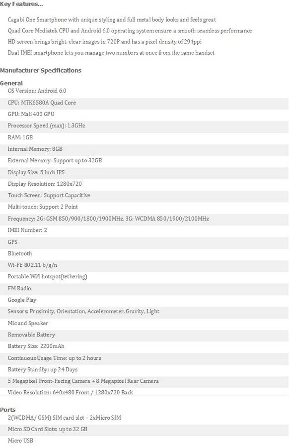 Cagabi One Android Smartphone - 720P 5 Inch Display, Dual SIM, Quad Core CPU, 8MP Camera, 3G (Black)