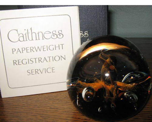 THIS PAPERWEIGHT COMES FROM CAITHNESS, AN ISLAND IN SCOTLAND, THE FACTORY IS FAMOUS FOR ITS HIGHLY COLLECTABLE GLASS WARE
