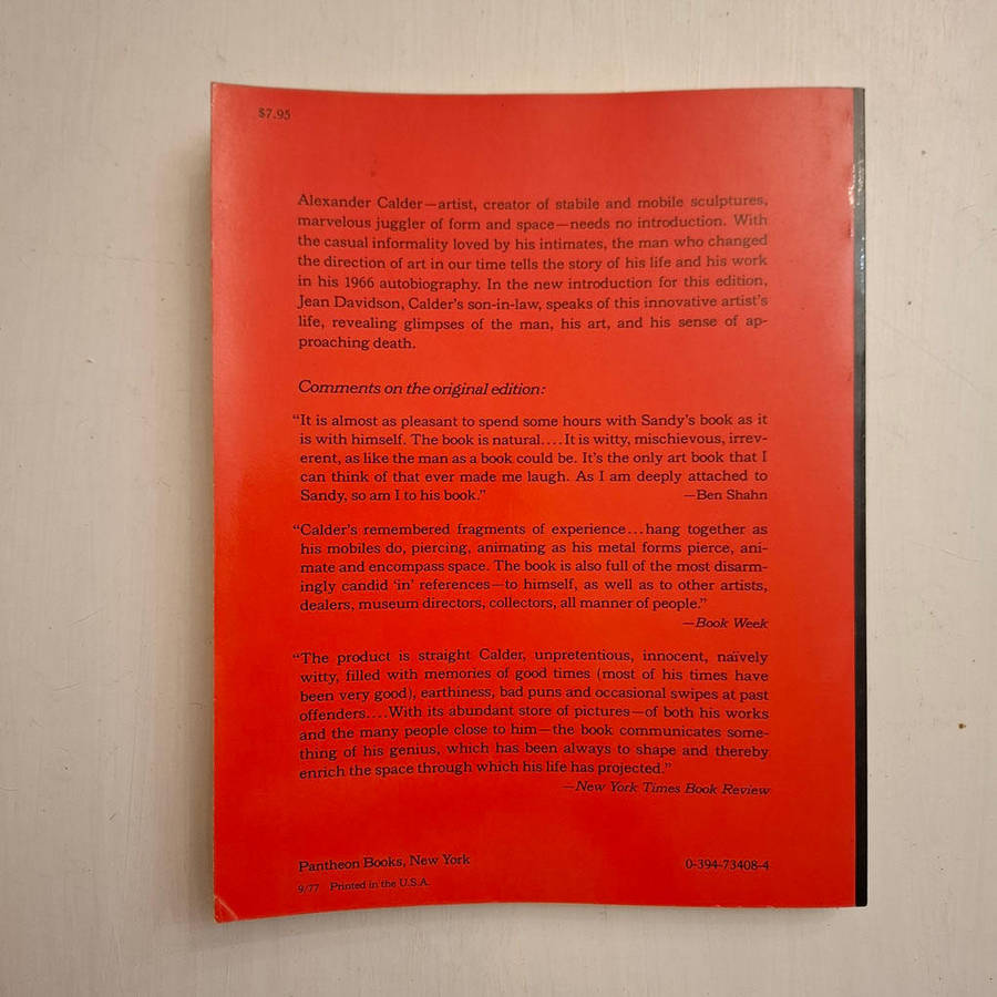 Publisher's note: "Alexander Calder--artist, creator of stabile and mobile sculptures, marvelous juggler of form and space--needs no introduction. With the casual informality loved by his intimates, the man who changed the direction of art in our time tells the story of his life and work in his 1966 autobiography. In the new introduction for this edition, Jean Davidson, Calder's son-in-law, speaks of this innovative artist's life, revealing glimpses of the man, his art, and his sense of approaching death."