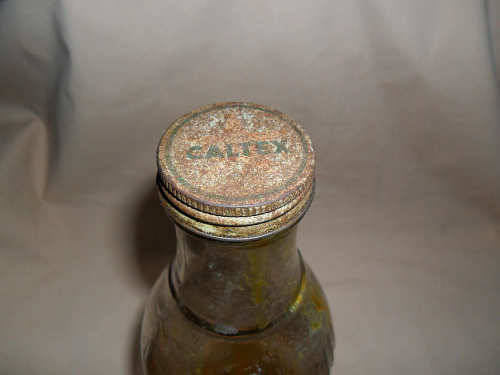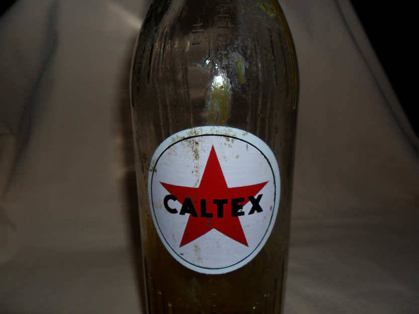 ANTIQUE CALTEX OIL GLASS BOTTLE PLUS CAP IN GOOD CONDITION - NO CHIPS OR CRACKS - BOTTLE HAS THE CALTEX LOGO - IT READS PROTEX AT THE BACK OF BOTTLE - FILL TO LINE NEAR THE TOP OF BOTTLE -THE BOTTOM OF BOTTLE READS - THIS IS THE PROPERTY OF CALTEX AFRICA LIMITED .
