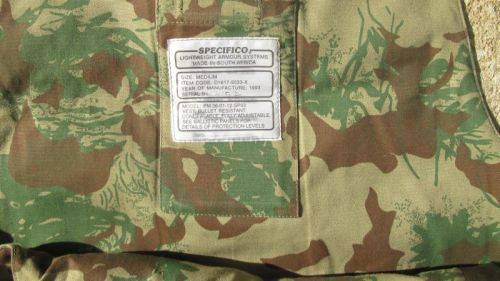 Obsolete SAP camo pattern bulletproof jacket. Used throughout the 1980s by the Riot Squad. Excellent original condition as pictured, label intact, size is medium- BALLISTIC PLATES NOT INCLUDED. Scarce; a really nice display item. Tracked postage is R45.00.