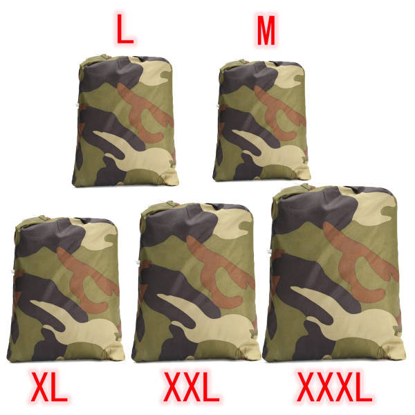 Package weight: 0.31 kg Description: Camouflage make your vehicle more safe Light and easy to carry, no space occupy, one storage bag Protect your vehicle's surface from being scratched by sharp objects Universal fit for ATV vehicle, scooter, motorbike, quad bike, bicycle and so on Waterproof fabric, effectively prevent rain water from entering the body, keep vehicle clean and tidy High flexibility material, anti-UV silver coating, blocking ultraviolet radiation to avoid your vehicle depreciation Cold-resistant can normally be use at -20°; anti-aging, can be use at high temperature above 50°, no deformation Elastic design can firmly fasten and completely wrap your vehicle, do not worry about wind blowing away the cover