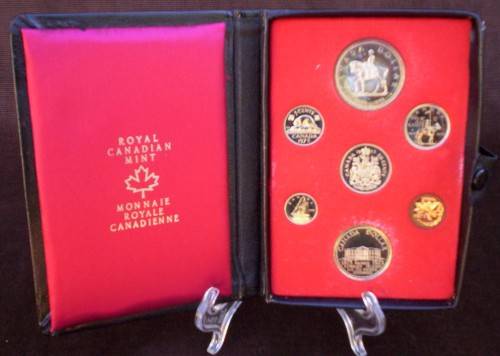 A Proof Set from Canada featuring the British Columbia Commemorative Dollar coin in a leatherette booklet- like case in excellent condition. Including the Silver Dollar commemorating the 100TH anniversary of the Royal Canadian Mounted Police(The Mounties). Sometimes referred to as prestige sets.