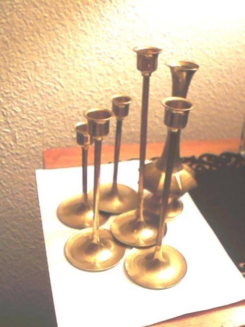 CANDLE STICKS SET OF 5, BRASS FROM 225mmt0 125mm, PLUS BRASS VASE 205mm W1503