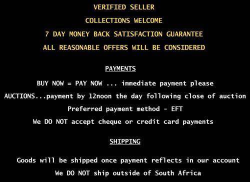 R35.00 Standard shipping using one of our trusted couriers applies to most areas in South Africa. Some areas may attract a R30.00 surcharge. This will be calculated at checkout if applicable. Check my rate
