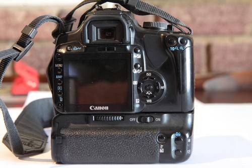 Canon Eos 400D and a Canon BG-E3 battery grip with 2 Canon batteries. The deal also includes a Canon RS-60E3 remote shutter release and the original Canon battery charger + body cap + PC connectivity cable. Cosmetic condition: 8/10