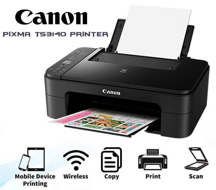Canon Pixma TS3140 Printer- (Print; Scan; Copy; Cloud) 7.7 ppm Black; 4ppm Colour print; Borderless printing; Flatbed Photo and Document scanner; COPY speed 27 sec. ; 20pages colour Cart. PG-445 & CL-446; Wireless, Retail Box , 1 year Limited Warranty