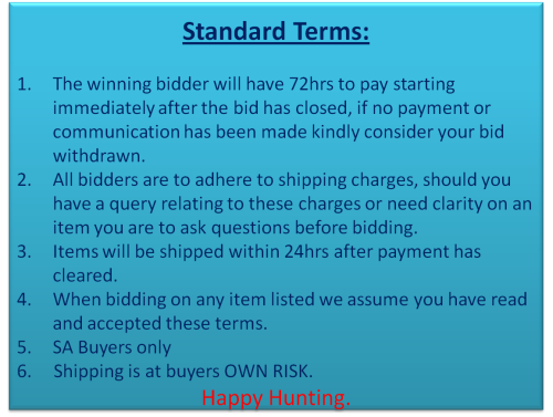 R35.00 Standard shipping using one of our trusted couriers applies to most areas in South Africa. Some areas may attract a R30.00 surcharge. This will be calculated at checkout if applicable.