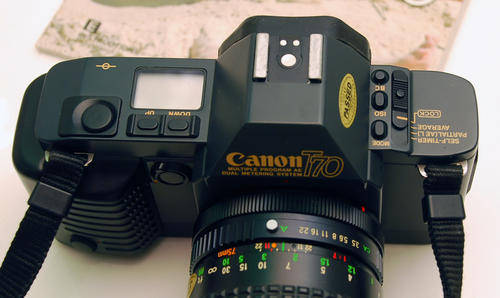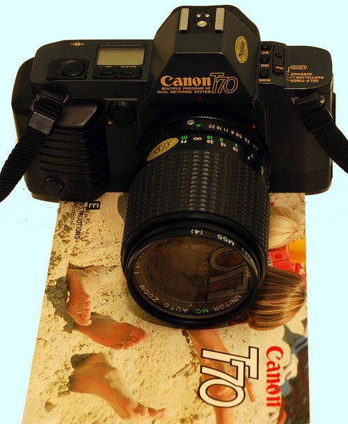 Canon T70 film camera (1988) + Unitor 35-75mm zoom lens.