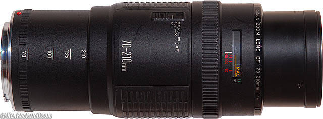 Size (measured): 2.975" diameter x 5.423" extension from flange (75.57 x 137.75mm) at 70mm focused at infinity. The Canon 70-210mm f/4 gets longer as zoomed and focused.