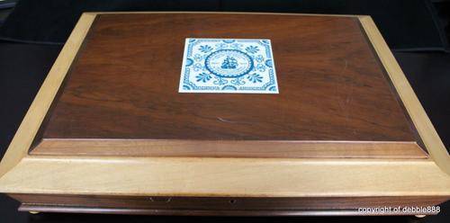 The wooden case is lockable (key included); there are slight scratches on the lid and around the sides; one little leg is missing. Although a bit worn, this box is beautiful, and made of solid wood. The blue and white picture on the lid is in fact a azulejo-style tile that has been inset into the wood.