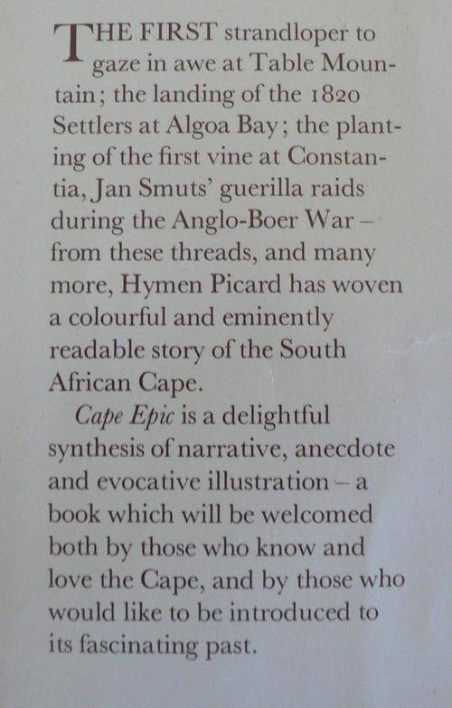 CAPE EPIC BY HYMEN PICARD, A MOSTLY PICTORIAL HISTORY OF THE CAPE,THE DUTCH SETTLEMENT, EARLY DWELLERS, THE EASTERN CAPE AND 1820 SETTLERS, THE DIAMOND FIELDS, THE BOER WAR RAIDS, UNION AND MORE.
