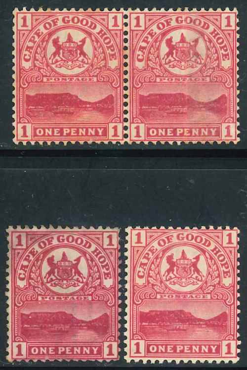 Four interesting Cape of Good Hope 1900 New Design 1d carmine and deep carmine stamps (SACC 64 and 64a) in unmounted mint condition (MNH) with some toning spots on the pair of stamps.