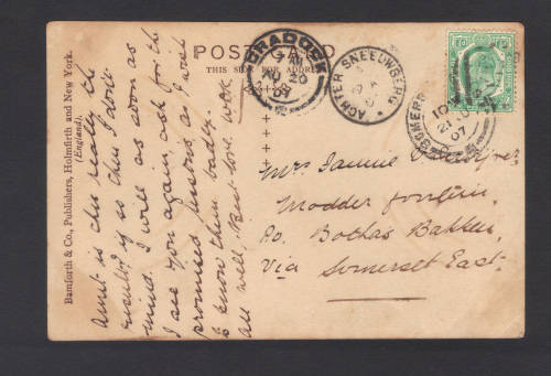 This Postal agency first listed together with AaSvogelkrantz in 1859, also listed 1860 to 1862. In 1862 it i was listed as Achter Sneeuberg and Aasvogelkrantz had disappeared. Postal agency opened 1862 as Achter Sneeuberg. Originally had its head office at Graaff Reinet and later Cradock. This card was posted at Achter Sneeuberg on 19 Aug 1907 went via Cradock 20 Aug and arrived at Somerset East 21 Aug 1907 . Office finnallt closed in July 1981 All strikes are nice and clear