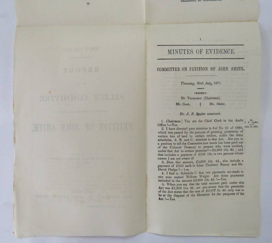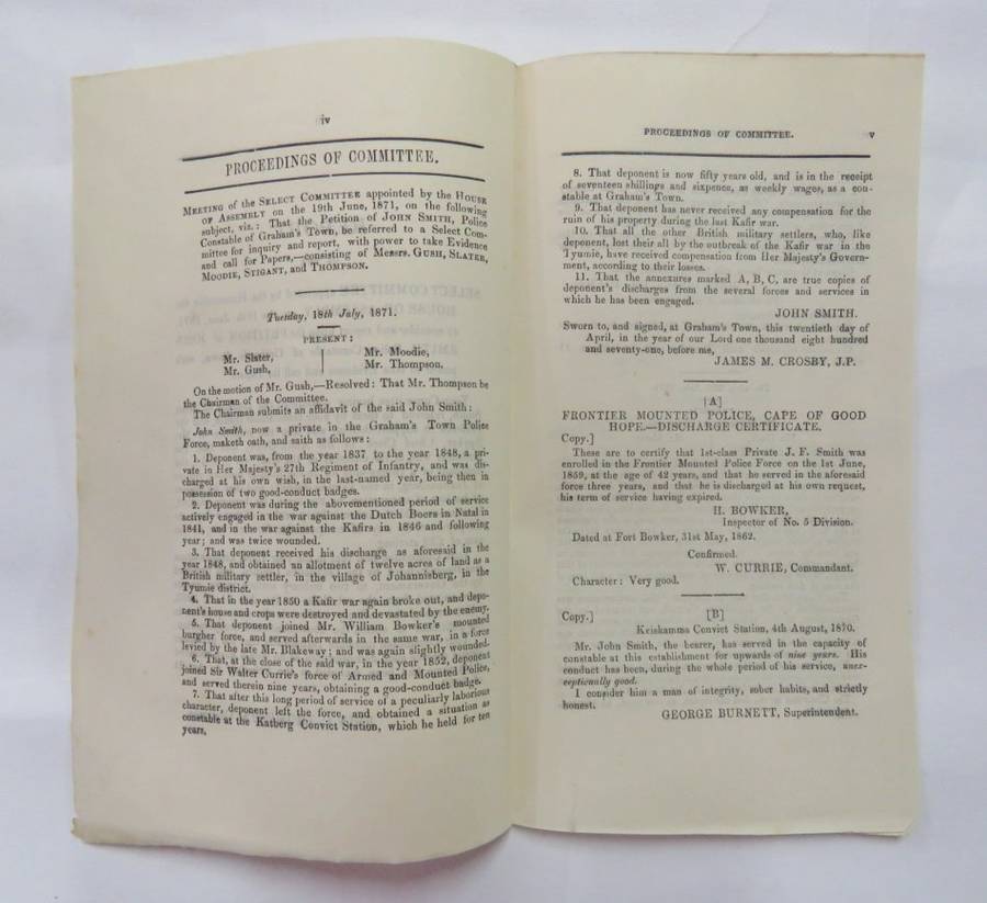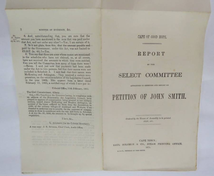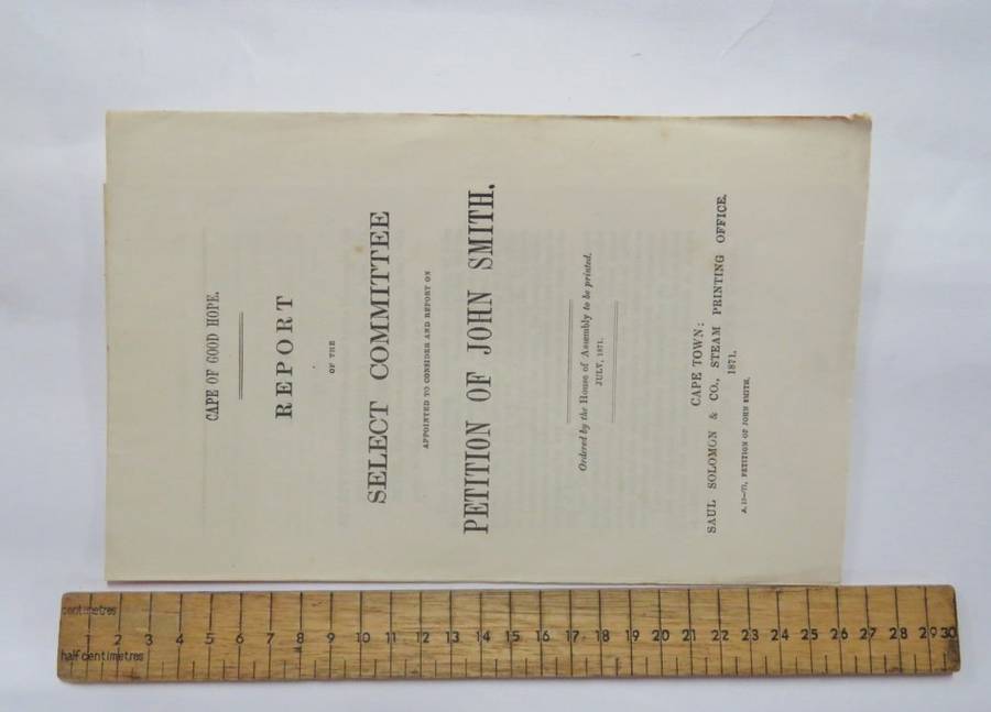 Cape of Good Hope report of the select committee on a petition of John Smith - 1871 - Police Constable of Graham's Town - Claim for compensation for land loss in the Frontier village Juannasberg 1850 - During the kafir war