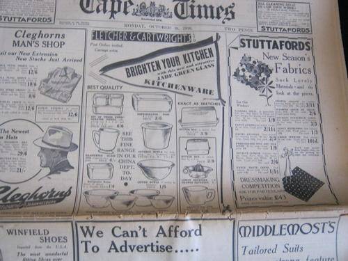 Cape Times October 19 1936, 26 pages, creasing, tearing along folds, age spots etc however all pages are quite readable & good condition considering the age.