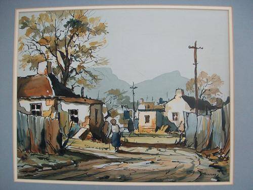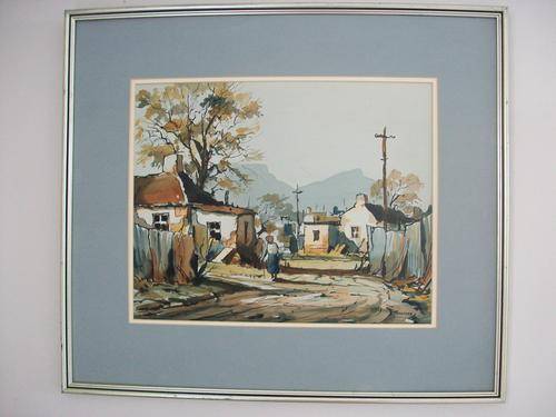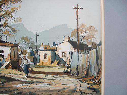 2. I recently sold a painting of his through bidorbuy, an exquisite scene of a country cottage. Though his work can be variable, this is another very very good one of a Cape Town township scene in winter with lines and colouring reminiscent of other Cape Impressionist winter works, including that of Boonzaier. Treasure has also painted his characteristic filagree tree branches against a traditional Cape scene.