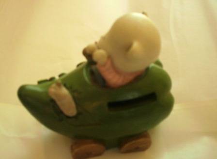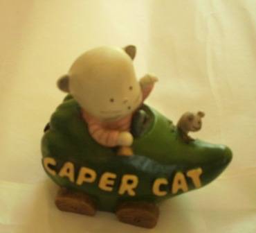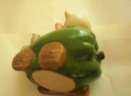 I am not sure what this ornament is made from. It has a hard yet smooth texture. The little cat is riding in what seems to be a big green pepper with a worm popping through on the side.