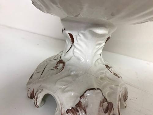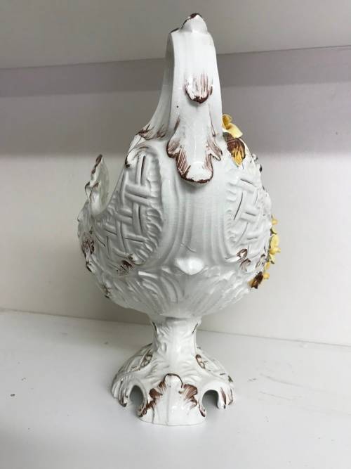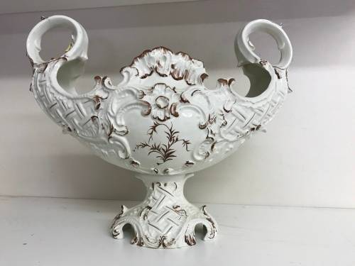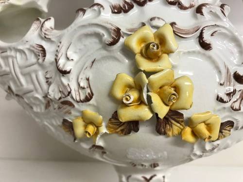 lovely Capidomonte bowl approx dimensions 350 mm over handles 300 mm h 150 mm wide. repair work on foot and small chips on rose as per pictures. Pictures form part of description please ask if unsure about anything.Postage R100-00. I parcel to best of my ability and cannot be held responsible for any loss or damage . I mail once a week on Friday mornings. Payment within 48 h after closure of auction please. Speedy payment ensures speedy delivery.