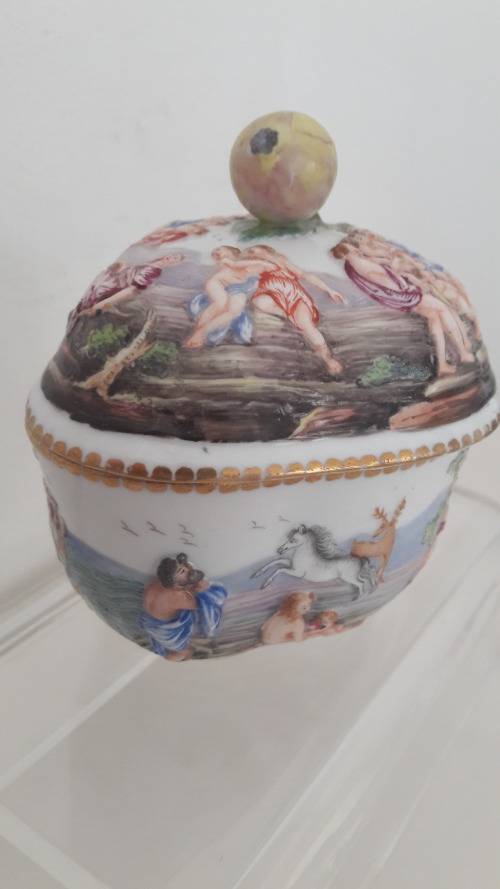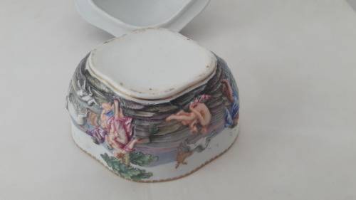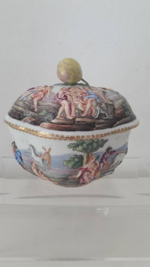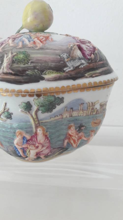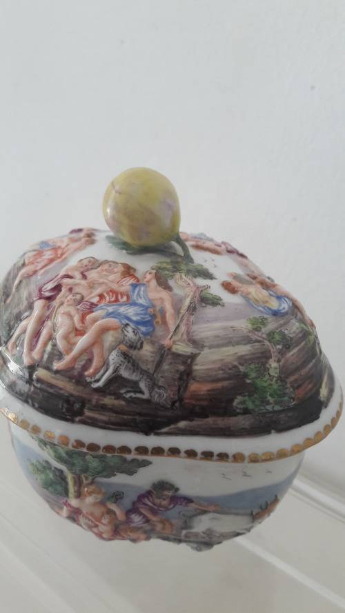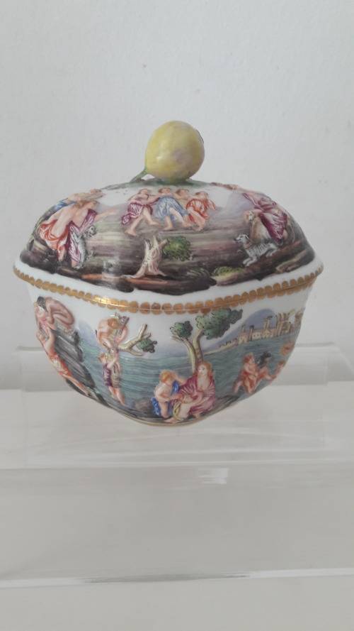 Offered for sale is a fine quality Capodimonte Naples Southern Italian porcelain trinket box dating to the late 19th Century . The bowl has an elegant quatrefoil shape with a domed lid with lobed sides and surmounted with a finial naturalistically shaped as a berry or fig. The bowl is made from soft paste porcelain profusely decorated with mythological figures in the Renaissance revival style ; the figures are modelled in shallow/low relief and hand painted in a bright palette of colours ; the upper rim of the bowl and lower rim of the lid are highlighted in a gilt pattern. Capodimonte/Naples porcelain has a 300 year old lineage with the influence of Meissen apparent in the elegant and opulent styling Size :.height including the lid 10.5cm ; length 12cm ; width 10cm.