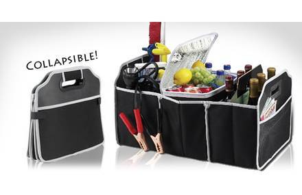 Three section collapsible trunk organizer with removable insulated cooler.