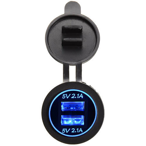 Car USB Twin Charger (2 x USB) Blue Panel Mount Round + Cap 12V:
