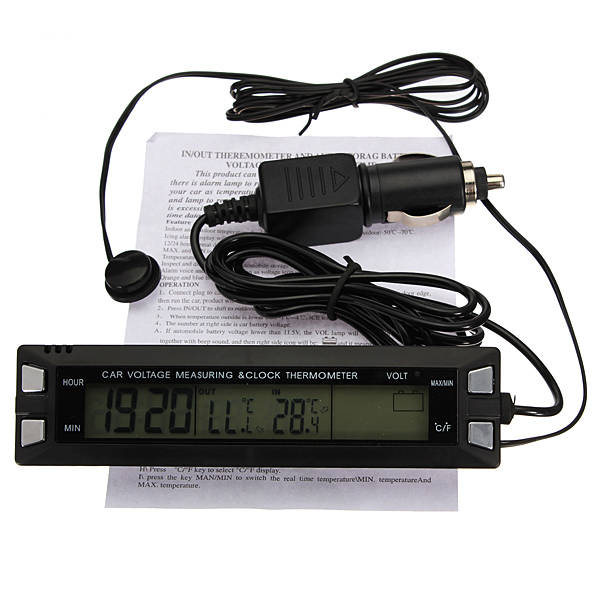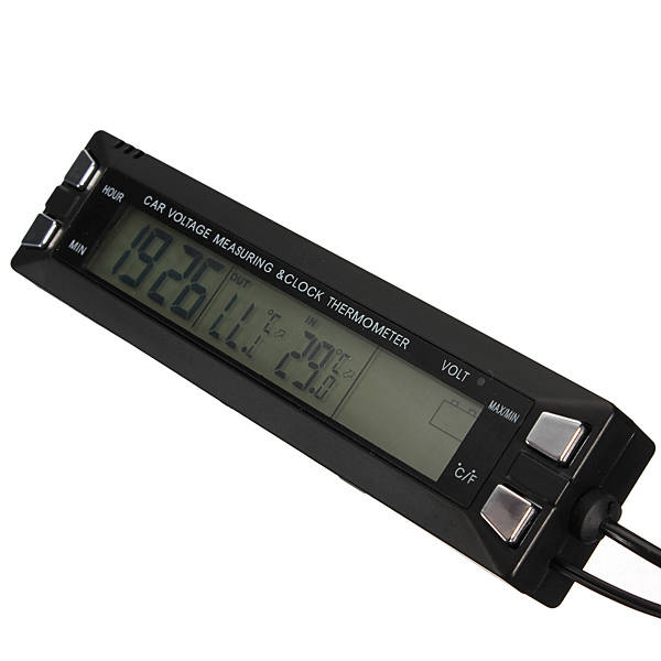 Description: Indoor and outdoor temperature display. Icing alarm display will turn on as temperature lower than -1¿¿¿. MAX. and MIN. temperature record. Temperature tendency function. Inspect and display real time automobile storage battery voltage. Alarm voice and lamp will turn on as voltage icon shows exorbitant or too low. Orange and blue back light is shiftable Specification : Power: clock and in/out temperature:AG13(included) Backlight is powered by cigarette adaptor, suitable for both 12V/24V cars Outdoor sensor cable length:1.5 meter. Material:ABS 12/24 hour format display. °C /°F temperature format display. Measuring range:-20¿¿¿- +60¿¿¿ Case color:Black Dimension:136*34*23mm Operation: Press HOUR key to adjust the hour vale. Press MIN key to adjust the minute vale. Holding °C/°F key to select 12/24 hour format. Press °C/°F key to select °C/°F display. Press the key MAN/MIN to switch the real time temperatureMIN.temperature and MAX.temperature. Package included: 1 X LCD Digital Thermometer