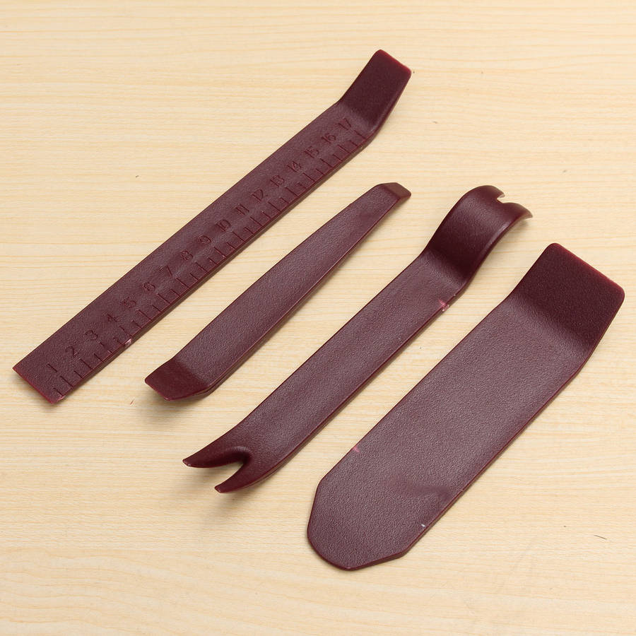 Description : 4Pcs Universal Car Dismantle Door Trim Panel Clip Lights Radio Removal Pry Open Tool Set A set of useful removal tool in the car is very helpful for car owners. Please look at this car radio removal tool set, it can solve the problem of removing car radio and repairing other parts of your car! Features : Easily remove Trim, Molding, Door panels and Dashboards. Great for automotive snap on trim panel and molding removal. Also works great for furniture repair soft and hard woods, antiques restorations, upholstery, leather work etc. Rugged durable plastic construction prevents marring. Works on interior and exterior trim, wide edge remover, narrow edge remover, pull-type remover, handle remover and upholstery clip remover. Easy to use and convenient to carry,save your space. Material : Plastic Package includes : 1 x Car Panel Removal Tool set (4Pcs) Details pictures :