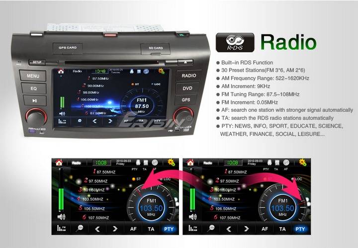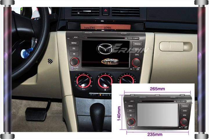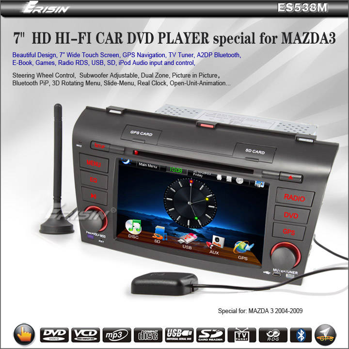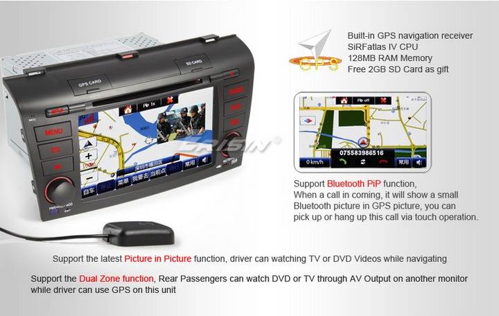 This unit is the latest Design for MAZDA3, it has beautiful appearance and can good match with original car, also it has built in the most popular and strongest function: HD Digital Touch Screen, fast response speed, Subwoofer adjustable, Dual Zone, Copy CD, Slide Menu, 3D Rotating Screen Menu, Picture in Picture, Steering Wheel Control, Open-Unit-Animation, Real Clock, Analog TV, GPS Navigation, Radio RDS, A2DP Bluetooth, Bluetooth PiP, IPOD Audio Input and Control, E-book, Games, Calendar, USB, SD and so on.