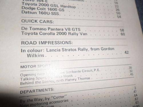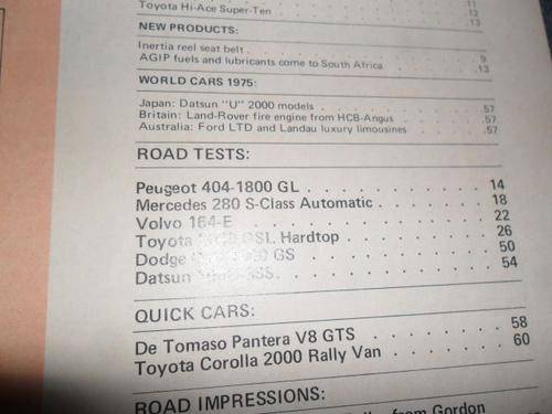 ( DODGE HUSKY 1700 PICK-UP , VW 1800 KOMBI KAMPER , FIAT 132 , TOYOTA HI-ACE 1600 SUPER 10 , PEUGEOT 404 GL , MERCEDE BENZ 280S AUTOMATIC , VOLVO 164-E , TOYOTA 2000 GSL , LANCIA STRATOS V6 , DODGE COLT GS , DATSUN 160U SSS , DE TOMASO PANTERA GTS , TOYOTA COROLLA 2000 RALLY VAN )
