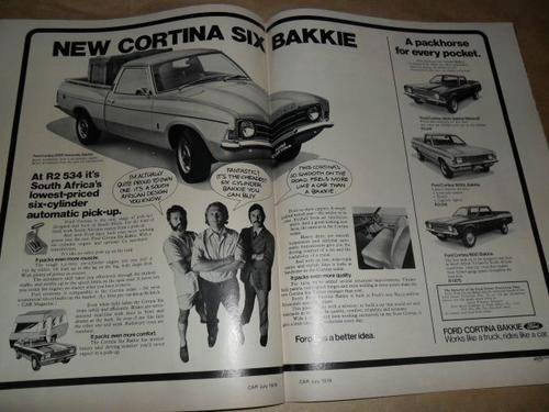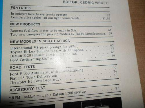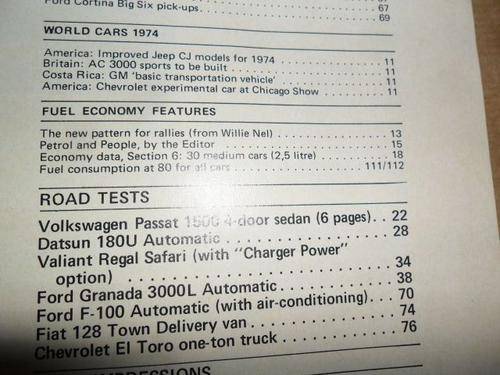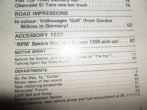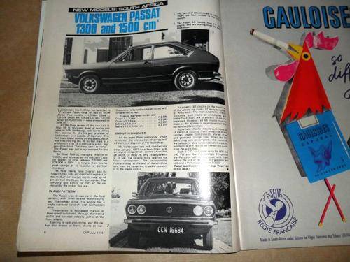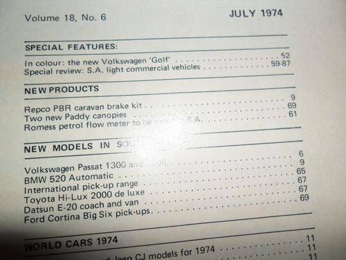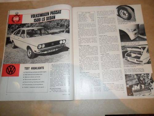 ( VW PASSAT FOLD-OUT AD , JAGUAR AD , RALLY , VW PASSAT LS PASSAT 1500 , DATSUN 180U AUTOMATIC , VOLVO 144E THE REJUVENATOR , VALIANT REGAL VJ SAFARI , FORD GRANADA 3000 L AUTOMATIC , FIAT 128 AD , MERCEDES S CLASS AD , VW GOLF , FORD GRANADA AD , SPRINGBOK SERIES OF TRUCKS , FORD F-100 TRUCK , FIAT 128 , CHEVROLET EL TORO TRUCK )