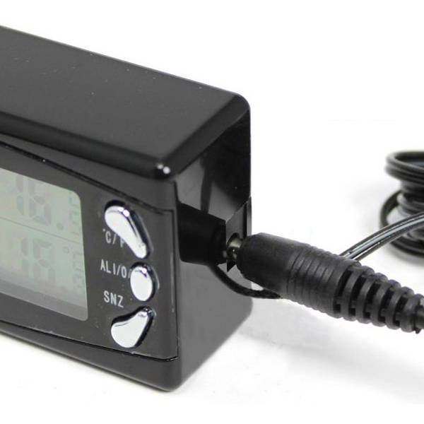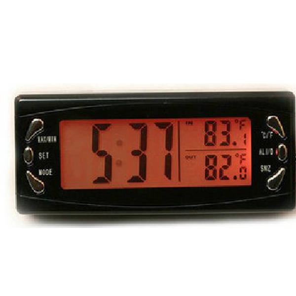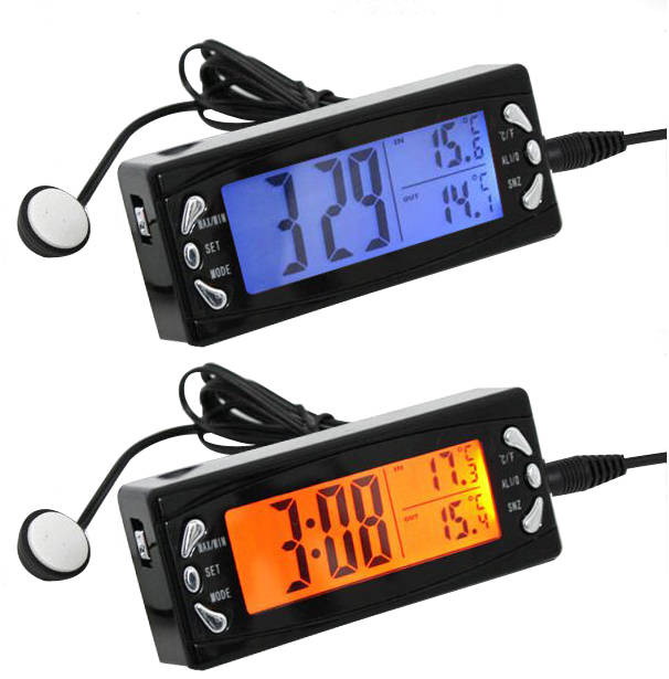 Package weight: 0.13 kg Description: Large LCD time display Alarm and snooze. Indoor & outdoor thermometer. 12/24 hours format. Min & Max temperature record. Measuring range:-50¬トテ-70¬トテ Display in either C or F with just a press on the key. Switch Between Blue or Orange Back Light. Powered by DC 12V car cigarette lighter. Weight: 105g Color: Black Dimension: 9 x 4 x 2cm(approx) Package Included: 1 x Car Clock Thermometer 1 x Car Plug