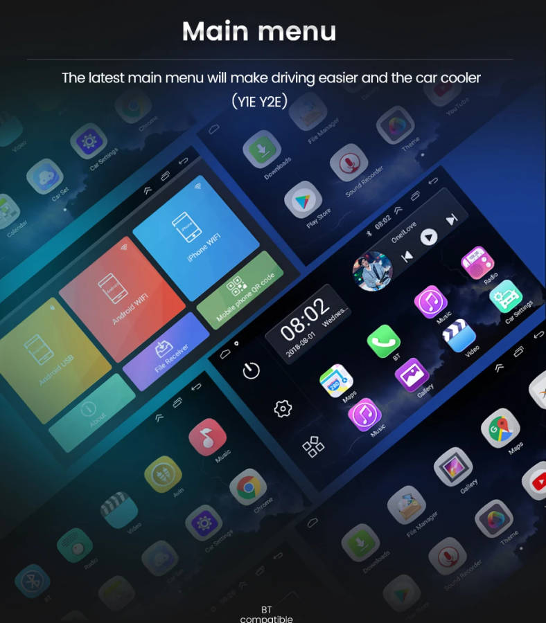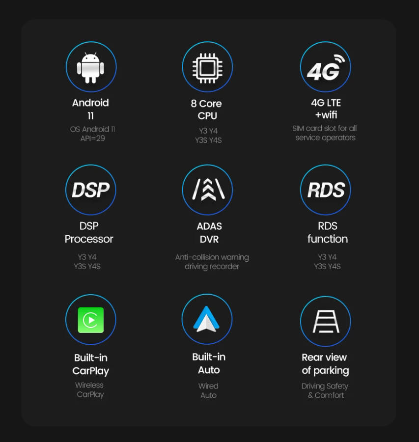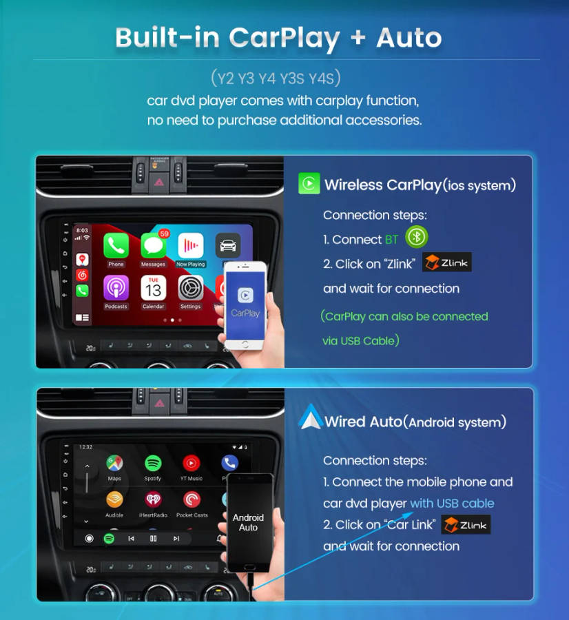 it have android auto and wirelss carplay both function too,do not need to buy extra dongle. easy to use phone app in the big headunit screen(just Y2/Y3/Y4/Y3S/Y4SBuilt in Carplay Android Auto)