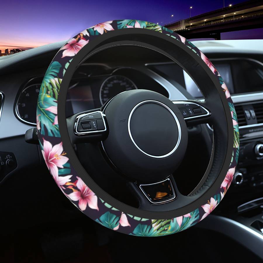 1pc Stylish Tropical Hibiscus Flower Steering Wheel Cover - Non-Slip, Easy-Clean & Durable Fit for Cars, SUVs, - Pink/Black/White/Gray/Beige with Green Leaf Design - Scratch-Resistant Wheel Protector - Ideal Gift for Women & Men (Car Interior Accessories)