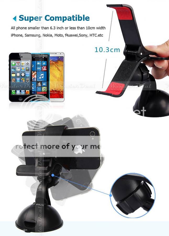 The longest width of the clamp stretching is 100mmCompatibility: Most models of Cell Phones, GPS, iPod, MP3, MP4! Such as i Phone 6S /Samsung Galaxy Note5 S4, GPS etc.