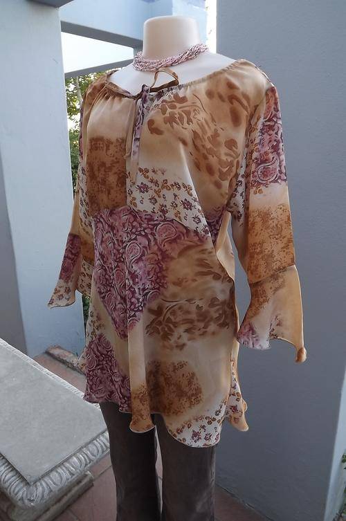 Caramel&Pink printed top.Size 40/16 by Michaela in polyester fabric.Elbow length sleeves with pointed cuffs.Elasticated neckline with tiestring..Good condition