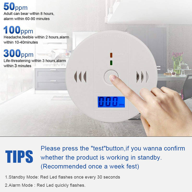4. ALARM STANDARD—50ppm, alert within 60 to 90 minutes; 100ppm, alert within 10 to 40 minutes; 300ppm, alert within 3 minutes. Note: When you test the detector, please do not use gas blow the hole directly.