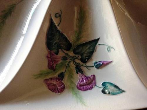The piece is an elongated dish with flowing lines and has superimposed hand painted purple hollyhocks, with realistic leafs and tendrils. Soft featherlike leaves accentuate the borders and flow of the dish.