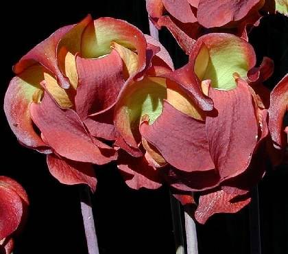 Sarracenia leucophylla is one of the most spectacular pitcher plants. The top of the leaf colors range from totally white, to white netted in green or white with red veins, or a combination of the three colors. Pitchers can reach up to 3 feet in height and over three inches in diameter. They produce large red nodding flowers.