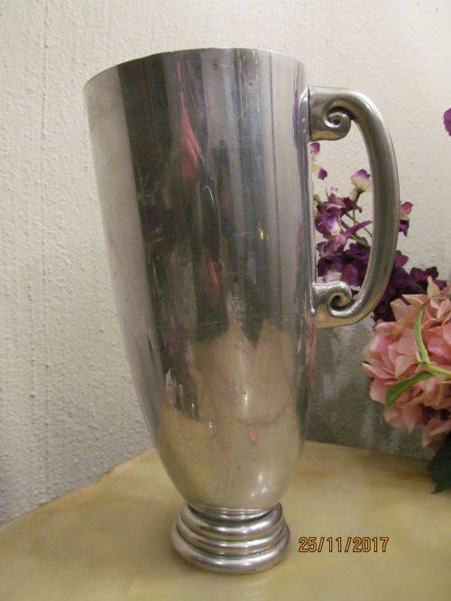 AN EARLY PEWTER WATER PITCHER / JUG DESIGNED AND MANUFACTURED IN THE WAVE DESIGN BY CARROL BOYES. THE JUG RESTS AT AN ANGLE UPON A GRADUATED CIRCULAR BASE AND HAS A BLACK COATED INTERIOR COMMON TO ALL THE PEWTER ITEMS OF THE WAVE PATTERN